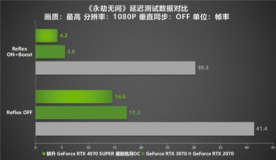 在《永劫无间》中,系统延迟的减少意味着用户的操作响应速度更为迅速。通过采用NVIDIA Reflex技术,为用户提供卓越的竞技体验。该技术将GPU与游戏进行优化结合,实时降低游戏时的系统延迟。通过测试数据可以清晰地观察到,在启用Reflex的增强模式后,游戏的系统延迟仅为4.2ms,相较于未启用情况,用户的系统延迟减少了10.4ms。而相较于GeForce RTX 3070和GeForce RTX 2070,其优势也很显著,分别降低了1.4ms和26.1ms。当玩家们使用NVIDIA 开发的G-SYNC显示器时,这一延迟的优化幅度将会更佳。毫无疑问,耕升 GeForce RTX 4070 SUPER 星极皓月 OC就是玩家们在高刷电竞领域下的最新优质选择。