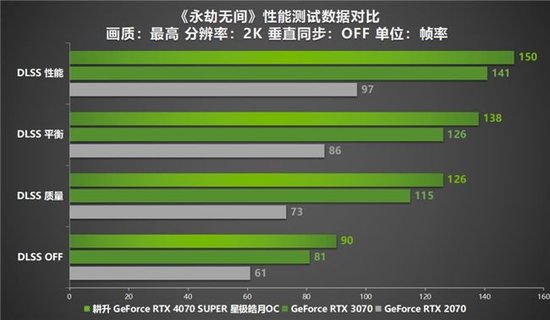 下面进行2K分辨率的测试。在未启用DLSS的情况下,耕升 GeForce RTX 4070 SUPER 星极皓月 OC仍然能够维持平均90帧的顺畅游戏体验。而在启用DLSS 2技术后,耕升 GeForce RTX 4070 SUPER 星极皓月 OC在性能模式下,平均帧率可达150帧,相较于GeForce RTX 2070,增加了平均43帧。在其他模式下,平均帧率也能够保持在120帧以上,相对于未启用DLSS时,最大帧率提升了60帧。