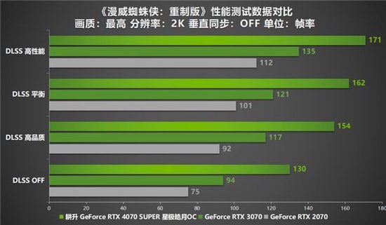 接下来是2K分辨率的测试。在不开启DLSS时,平均帧数依然能保持在130帧,实现游戏流畅运行。在开启DLSS 2后,耕升 GeForce RTX 4070 SUPER 星极皓月 OC在高性能模式下可以达到平均171帧,而高品质模式下也能保持在平均154帧的极高帧数。这个帧数让玩家能够享受到非常顺畅的游戏体验。