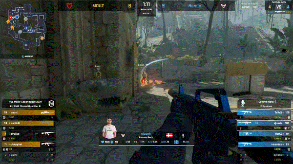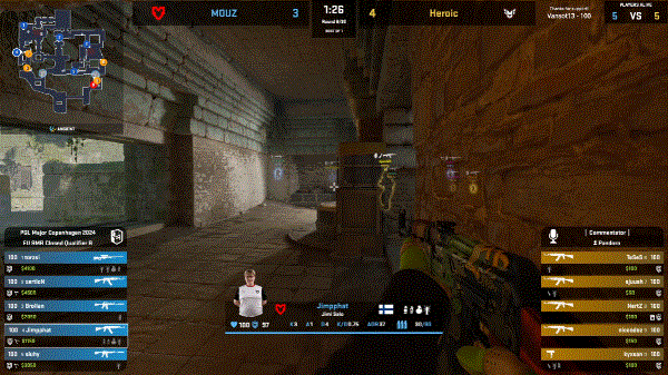 比赛开始,来到选图Ancient,Heroic先做进攻方,手枪局Heroic4人进攻A区,打掉A区防守CT后率先拿下手枪局,接着一波中路默认接住想要前顶的CT,顺势拿下第二分。