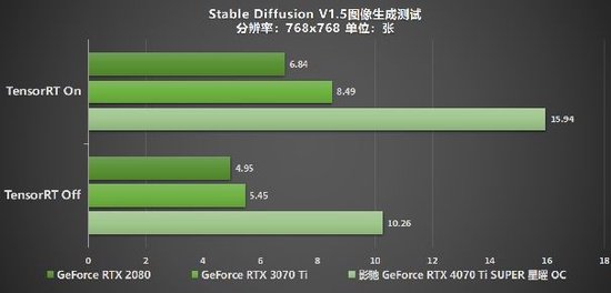 对于512x512分辨率的图像生成而言,影驰GeForce RTX 4070 Ti SUPER 星曜 OC每分钟可生成17.01张图像。而GeForce RTX 3070 Ti每分钟则能生成8.91张,GeForce RTX 2080的均值与其差不多,达到8.44张。影驰GeForce RTX 4070 Ti SUPER 星曜 OC对比其余两张卡的生产力,拥有明显的优势。特别是在开启TensorRT 加速后的影驰GeForce RTX 4070 Ti SUPER 星曜OC,每分钟可生产的512x512规格图像则高达34.02张。