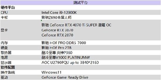 测试环节为了能够完美的发挥出影驰 GeForce RTX 4070 Ti SUPER 星曜 OC 的优异性能,配置上也是选择了Intel Core i9-12900k平台处理器,主板采用影驰Z690金属大师主板,内存配备了影驰20周年之际为用户们推出的影驰 HOF PRO DDR5-7000。这款内存具备了超越标称频率的能力,给与用户更大的容量、更高的频率、更低的功耗。固态上采用了影驰 HOF Pro 2TB。PCIe4.0 固态的超高读写速度搭配超高性能的配置让影驰 GeForce RTX 4070 Ti SUPER 星曜 OC 的性能在测试中得到持续稳定的发挥。