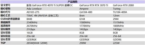 首先来看一下影驰GeForce RTX 4070 Ti SUPER 星曜 OC的规格参数与GeForce RTX 3070 Ti 和GeForce RTX 2080 的对比:
