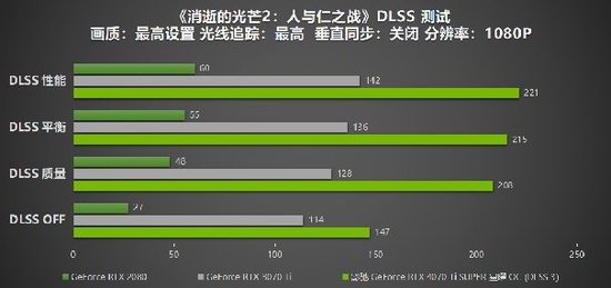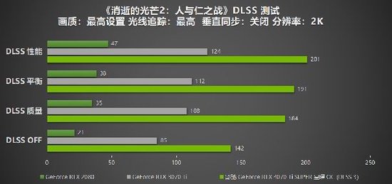影驰 GeForce RTX 4070 Ti SUPER 星曜 OC 在2K分辨率 下依旧保持着优良的表现,在自身性能加持下帧数达到142帧。最高则是在开启DLSS 3性能模式后,达到了破200帧的好成绩。如果用户想要进行《消逝的光芒2:人与仁之战》,首选自然还是影驰 GeForce RTX 4070 Ti SUPER 星曜 OC ,随后是GeForce RTX 3070 Ti。至于GeForce RTX 2080的表现,还是显得稍许的吃力了。