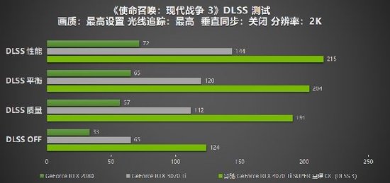 由于这主要还是一款射击类游戏,相较前两款游戏而言,对于硬件的要求并没有这么苛刻。所以可以看到,即便在2K分辨率下,三张显卡的表现都还是非常不错的。即便是GeForce RTX 2080,在DLSS 2的加持下帧数也到达了72帧。更不用说影驰 GeForce RTX 4070 Ti SUPER 星曜 OC ,在高分辨下依旧是可以保持在215帧的高分 。