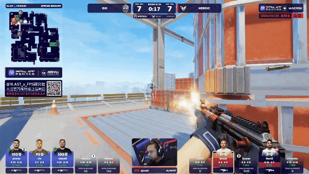 易边再战,Heroic B区做动静后攻打A区,BIG直接退后点守,随后3v3回防BIG有钳子直接强拆赢下手枪局。下一局Heroic直接强起抢A坡和对手1换2,之后顺势攻打A区,BIG再次赢下回防残局,追平比分。Heroic再次硬刚和BIG在A坡互换人头,随后双方3v3,Heroic攻打B区被s1n和prosus接完,BIG反超比分。