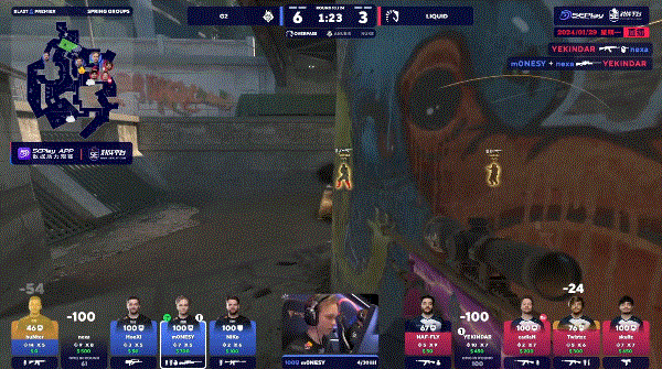 下半场攻防转换,G2来到进攻方,开局4人在B外等待NiKo在A区做动作,但是A区只有一人在后点防守,时间不够无奈G2只能强行打B,刚好遇到重防B区的Liquid,一波交火后G2输掉手枪局,NiKo更是活到最后没有加钱。次回合G2强起,连丢三分。