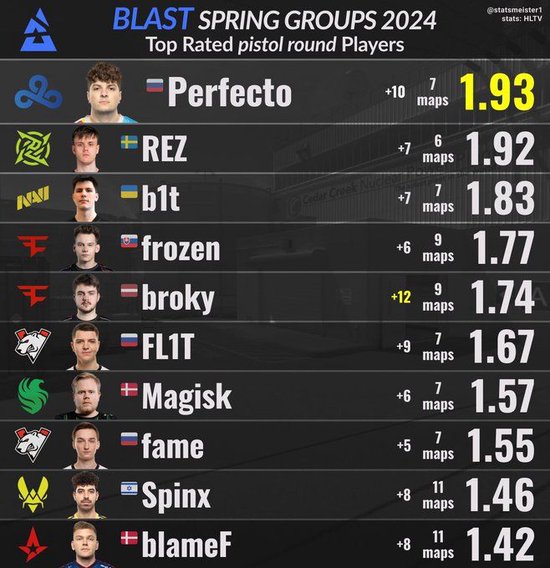 BLAST 春季小组赛选手手枪局数据一览。随着昨晚的比赛结束,BLAST Premier春季小组赛也落下帷幕。赛后有CSer整理了本次赛事选手们的手枪局发挥。