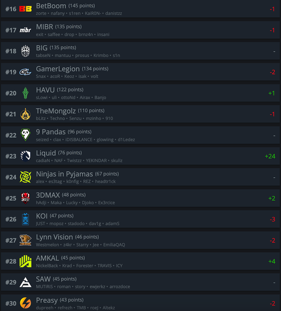 21-30名中进步最大的则是Liquid战队,他们的世界排名进步24名,位列23名。同样排名上升的还有AMKAL,他们凭借打入欧洲RMR进入TOP30榜单。