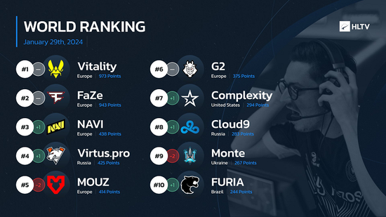 今天HLTV公布了最新一周的世界排名。经过BLAST Premier春季小组赛的洗礼,榜单出现了一定的变化。1-10名中,第一名和第二名依旧是Vitality和FaZe战队。但MOUZ战队掉出了前三名来到第五,Natus Vincere则成为TOP3战队。