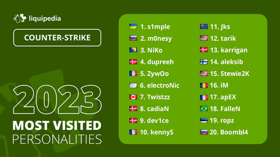 液体百科分享了2023年用户用行动选出的最受欢迎选手。排名第一的是Oleksandr Kostyliev | s1mple,第二名是Ilya Osipov | m0NESY,第三名则是Nikola Kovač | NiKo。