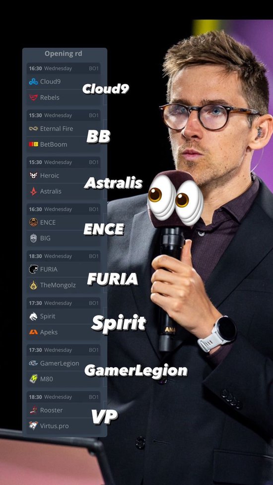 他们分别是Cloud9、BB、Astralis、ENCE、FURIA Esports、Spirit、GamerLegion、Virtus.pro。