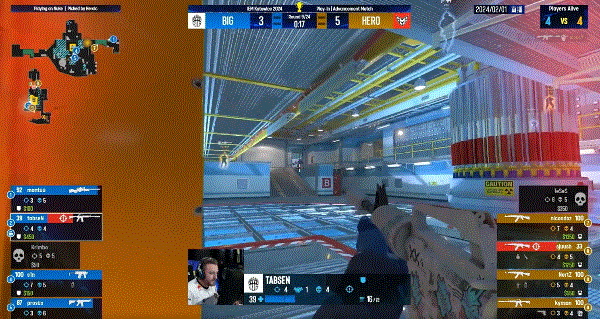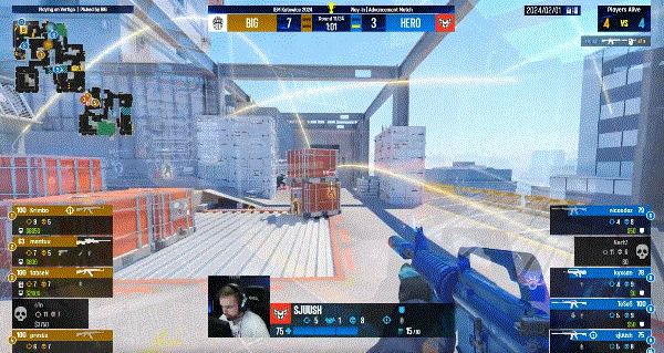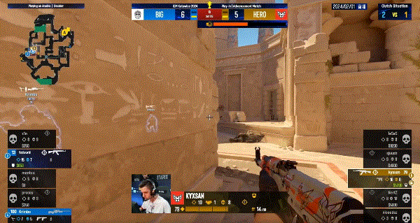 下半场攻防转换,BIG来到进攻方,开局中路跳水下进入小黑屋,CT马上追到屁股,双方交火后形成2v2残局,最后CT抓住两个Timing击杀BIG赢下手枪局,次回合BIG强起提速A区,但是Heroic手感火热全部接住,第十六回合BIG五把沙鹰,打掉Heroic两把枪。
