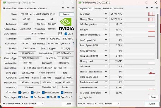 首先是影驰GeForce RTX 4080 SUPER 星曜 OC最为核心的部分——采用 TSMC 4N NVIDIA定制工艺的Ada Lovelace 架构核心。该架构在其前身Ampere的基础上进行了多项改进,所搭载的第三代 RT Core 和第四代 Tensor Core提高了光线追踪性能,且进一步加速深度学习运算。影驰GeForce RTX 4080 SUPER星曜 OC核心代号为AD103-400,拥有10240个CUDA处理器,提供 52个FP32 shader-TFLOP S 用于染传统光栅化图形,320 第四代 Tensor Cores 提供836个 ATOPS 用于 AI处理技术和 DLSS 技术,80 个第三代 Ada RTX Cores提供 121 RT- TFLOPS 为下一代光线追踪提供动力!得益于改进的RT核心,RTX 40 SUPER系列在实时光线追踪渲染方面的能力得到了大幅提升。同时也实现提供更多的并行处理能力,进一步提高了图形和计算性能,为用户带来极致的性能输出。其基础频率达到2295MHz,加速频率更是上涨到2610MHz。