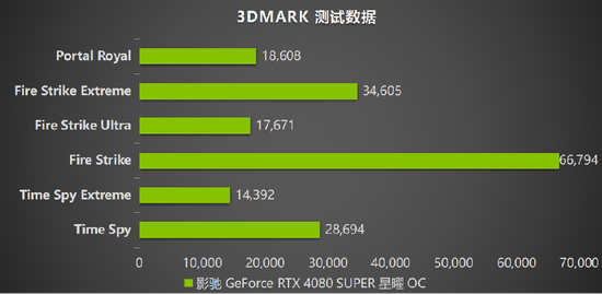 影驰 GeForce RTX 4080 SUPER星曜 OC在3DMARK测试中,显卡分数为28694分。3DMark Fire Strike DX11测试的分数也达到了66794,在3DMark Portal Royal光追测试的成绩则为18608。总体分数表现算的上是优异,即便在运行3A光追游戏大作时,也能够给与用户们一个优异的性能体现。