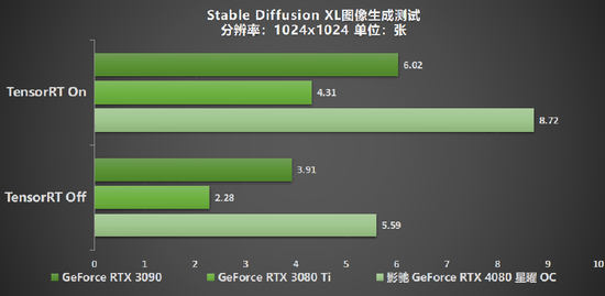 在SD V1.5测试下选择了512x512和768x768两个分辨率进行测试:在512x512分辨率的图像生成中,影驰 GeForce RTX 4080 SUPER星曜 OC 在开启TensorRT 后,每分钟能生成的图像高达近40张。