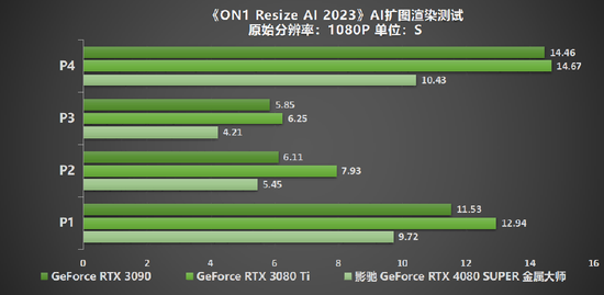 通过数据对比,可以看到GeForce RTX 3080 Ti 和GeForce RTX 3090两张显卡之间的性能差距并不是特别明显。但是影驰 GeForce RTX 4080 SUPER星曜 OC 却以绝对的优势,以最短的时间进行图像的处理。