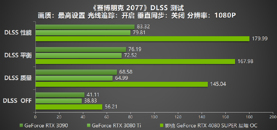 在《赛博朋克 2077》中,已经支持了NVIDIA DLSS 3.5技术。NVIDIA DLSS 3.5技术解决了目前光追游戏中,人工设计的降噪器所带来的画面质量问题,优化光追游戏画质。使用AI降噪技术取代了传统的降噪器,通过“多帧结合”或者“空间插值”的方法来填充像素的缺失,让光追画面更倾近于真实的物理世界。达到提升帧率的同时,再现细腻至极的画面质感,赋予每一帧生命般的动感。在游戏实测中,影驰 GeForce RTX 4080 SUPER星曜 OC 将开启DLSS 3.5模式,GeForce RTX 3080 Ti 和GeForce RTX 3090 将开启 DLSS 2模式。