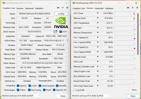 通过2.57版本的GPU Z,可以看到耕升 GeForce RTX 4080 SUPER 炫光 OC中具体的参数表现和实际规格。