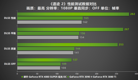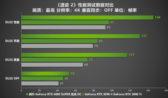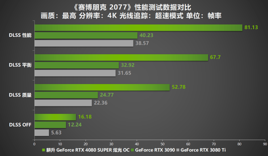 通过DLSS 3.5技术,可以发现耕升 GeForce RTX 4080 SUPER 炫光 OC的表现相当出色。在4K分辨率不同模式下,帧数领先前代显卡两倍左右。