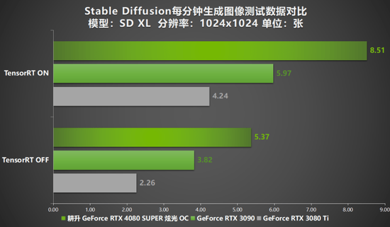 在未开启TensorRT加速的情况下,耕升 GeForce RTX 4080 SUPER 炫光 OC每分钟可以生成图像5.37张。当开启TensorRT加速后,生成水平则是得到了巨大提升,能够达到每分钟8.51张的水准。
