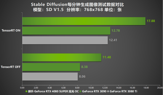 而生成768x768图像时,在不开启TensorRT的情况下耕升 GeForce RTX 4080 SUPER 炫光 OC每分钟可以生成图像11.48张。当开启TensorRT加速后,生成速度则达到了每分钟17.88张,让用户的体验得到质的提升。