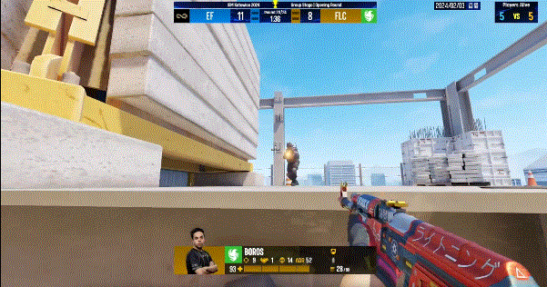 下半场攻防转换,EF来到进攻方,手枪局五人进攻铁板,打掉BOROS后进入包点下包,但是在守包时被Falcons击败输掉手枪局,次回合强起也只打掉两把枪。