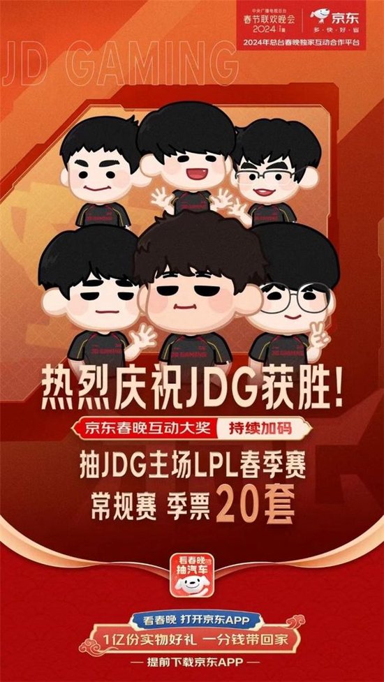 《2024年春节联欢晚会》将于除夕夜晚8点正式与观众见面。作为2024春晚独家互动合作品牌,京东除了在除夕夜为海内外观众送上1亿份实物好礼外,更持续加码互动大礼。近日,为了庆祝京东电子竞技俱乐部(以下简称:JDG)在2024 LPL春季赛常规赛中的获胜,20套JDG主场的LPL春季赛常规赛、季票将在春晚期间送出,只需1分钱,就能亲临LPL比赛现场,观看JDG战队的精彩表演。