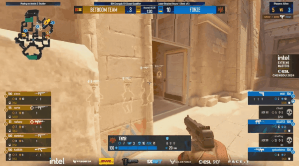 图二为BB选择的Overpass,先作进攻方的他们击杀厕所和下水道口的CT,随后他们抱团攻打A区顺利赢下手枪局。第三局,BB快提B区被三人在B的CT一一接住,r3salt拿到三杀帮助forZe得到第一分。经济尴尬的BB只能选择强起,有着两把手枪的他们进攻难以展开,这局输了后BB只能eco,forZe顺势反超比分来到3-2。第六局,shalfey和tN1R前顶A大拿到双杀,虽然之后nafany在A区找回场子,但单摸B区的土匪掉点也宣告了他们这局的失败,但很快下局半起的BB沙鹰发挥完成翻盘,第八局BB更是在A大和厕所中段的争夺中获胜,比分来到4-4平。这下轮到forZe没钱,他们保下的两把枪也没能发挥作用,BB反而将比分领先。下一局长枪局forZe也没能赢下,比分逐渐拉开。上半场结束,BB以7-5领先。