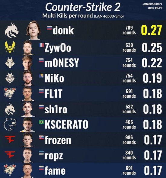 位列第一的是Spirit天才少年donk。他在709回合中有着平均每回合0.27的多杀,超过第二名ZywOo,后者在639张地图上有着0.25的多杀数据,在样本量和数据上都逊色于donk。第三名m0NESY样本量超过donk,但多杀数据为0.22,落后于donk。
