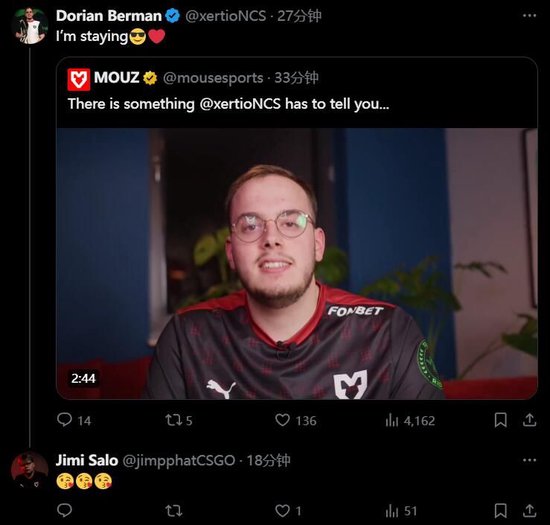 今天MOUZ在官方推特上宣布已经同队员xertioN签订新合约,在他之前 torzsi、siuhy和教练sycrone都已经和俱乐部完成了续约工作。