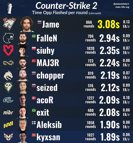位居榜首的是Virtus.pro战队的指挥Dzhami Ali | Jame,在866个回合中,Jame平均每回合致盲对手时间长达3.08秒,排名第二、三位的分别是FURIA和MOUZ的指挥Gabriel Toledo | FalleN和siuhy,他们平均每回合致盲对手2.94、2.35秒。