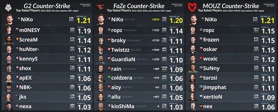 有意思的是在这三支队伍中,排名第一的都是NiKo。在G2,NiKo贡献出了539图1.21的rating、FaZe则是792图1.20rating、MOUZ为215图1.21rating。