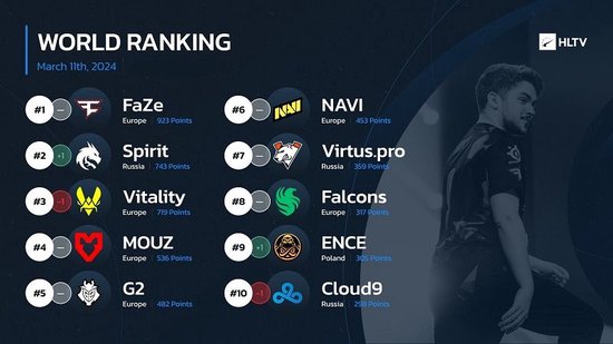 今天HLTV更新了最新世界排名,1-10名变化幅度很小。Spirit战队上升一位取代Vitality成为世界第二,同时ENCE上升一位取代Cloud9成为第九名。