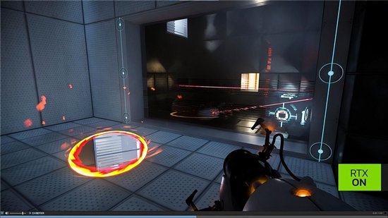 在最初的《传送门》RTX 版中,游戏加入NVIDIA的全景光线追踪技术,也称为路径追踪,尝试为玩家打造一个沉浸式的游戏世界。这项技术能够精确模拟真实世界中的光线属性,从而为游戏中的表面和物体带来逼真的光照、阴影、反射和折射效果。游戏中的每个物体,包括地板、墙壁等,都经过了重新设计,以呈现更加真实的材质细节,如玻璃的反射和金属的光泽。这些改进不仅让游戏的关卡和效果显得更加细致和动态,也让玩家体验到如同现实世界般的光影变化,极大地提升了游戏的真实感和沉浸感。
