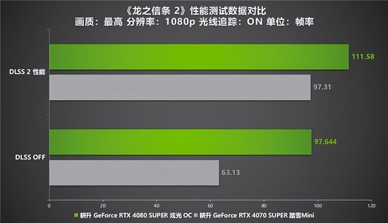 在1080P分辨率下进行测试时,我们发现《龙之信条 2》的优化水平还不错。当关闭DLSS技术时,两款显卡的帧率表现不错,耕升 GeForce RTX 4070 SUPER 踏雪Mini和耕升 GeForce RTX 4080 SUPER 炫光 OC分别能达到平均63.13帧和97.644帧。足以让游戏流畅运行。而一旦开启DLSS 2性能模式,游戏帧率更有显著提升,最高画质下游戏画面流畅稳定。在此模式下,RTX 4070 SUPER 踏雪Mini的帧率能够稳定在平均97.31帧,而RTX 4080 SUPER 炫光 OC更是达到了平均111.58帧,轻松超越了100帧的大关。
