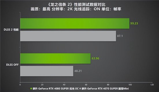 接下来是2K分辨率的测试。在关闭DLSS 2性能模式时,两款显卡的平均帧数有所下降,耕升 GeForce RTX 4070 SUPER 踏雪Mini和耕升 GeForce RTX 4080 SUPER 炫光 OC的平均帧率分别降低到了48.21帧和63.96帧。但当DLSS 2性能模式开启后,两款显卡的帧率均有所提升,达到了流畅的游戏体验。RTX 4070 SUPER踏雪Mini的平均帧率稳定在87.1帧,而RTX 4080 SUPER炫光 OC的平均帧率更是超过了90帧,达到了99.23帧。