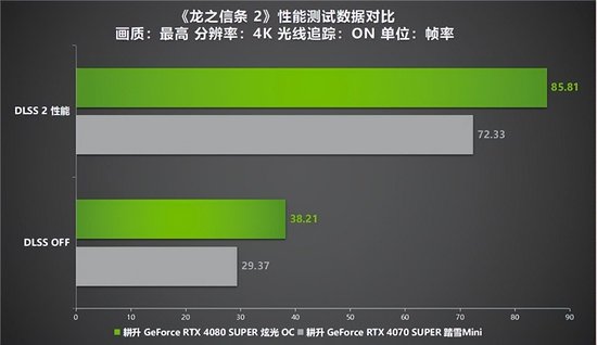 在4K分辨率下进行测试时,耕升 GeForce RTX 4070 SUPER 踏雪Mini在开启DLSS 2性能技术后,平均帧率可以达到72.33帧,依然能保证游戏全程的流畅体验。相比之下,耕升 GeForce RTX 4080 SUPER 炫光 OC作为一款4K级别的显卡,表现更加出色,平均帧率达到了85.81帧。