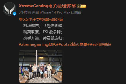 XG微博官宣旗下队员已出发前往英国伯明翰,他们将备战4月精英联赛的第二阶段(欧洲线上赛)和ESL ONE伯明翰站(英国伯明翰线下赛),以下为XG微博原文: