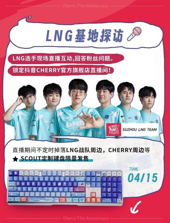 4月15日晚,英雄联盟知名电竞战队LNG将空降CHERRY官方旗舰店的抖音直播间,观众们可以跟他们在线上互动交流,直播期间更有LNG战队周边、CHERRY周边掉落,同时,当天还会发布S11全球总决赛冠军及FMVP选手Scout李汭燦的定制键盘,如果你是LNG的粉丝,那千万记得调好闹钟,去和选手们唠唠嗑,说不定还能带走各种周边。