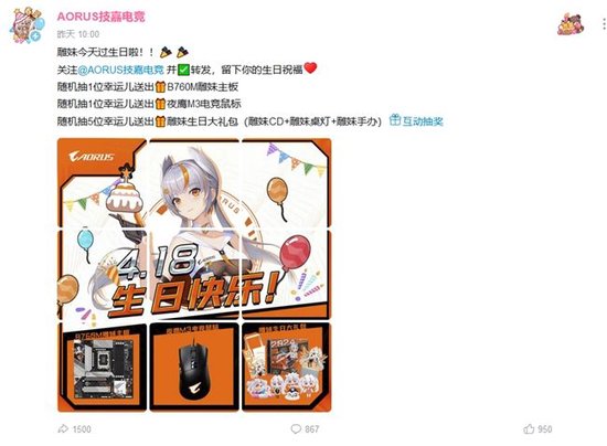 为庆祝旗下虚拟偶像“雕妹”正式亮相一周年,4月18日技嘉在抖音(技嘉AORUS俱乐部)和B站(AORUS技嘉电竞)官方账号平台召开“雕妹生日会”直播活动。活动期间主播“雕妹”疯狂“宠粉”,不仅有精彩的互动和才艺表演,并且全程循环抽奖送福利,同时还带来了一款以雕妹为主题打造的定制B760M新款主板,引发众多粉丝热议关注。