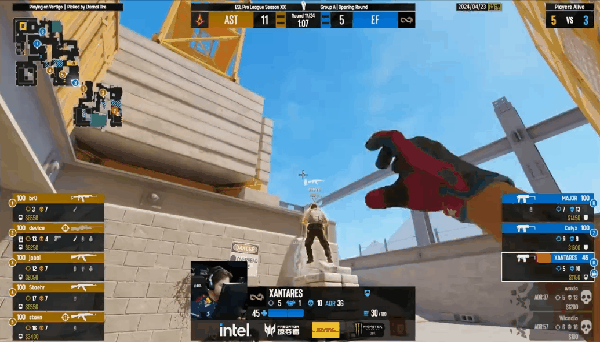 比赛来到第5回合,开局EF选择常规默认,他们打算用枪法强行撕开Astralis的防守,而Astralis这一回合也出现了失误,Staehr在黄布进行防守时由于大坡烟散的太快,导致他没有办法再退回A小,只能在黄布附近架一个非育苗位,而EF在第二时间的推进时直接将其秒杀。随后stavn顶防到了起重机前,阿汤哥抓闪反清,而stavn出现了枪法失误只换掉了一人,随后补枪的队友也没能顶住被全部击毙,阿汤哥爆头位架狙硬拼失败,BRO的回防也被断住。EF用枪法打出了一波漂亮的2换5,轻松拿下了这一分的胜利。