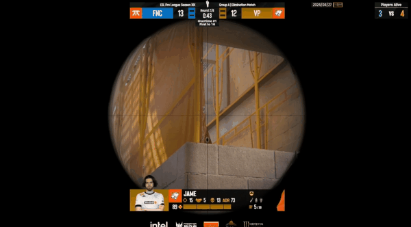 FL1T一个精彩的1v2残局没能让VP占据比分优势,第九回合fnatic爆弹B区,kyuubii中路绕后断掉两人,MATYS双杀收下1v2残局,下回合Jame的大狙3杀帮助队伍翻盘。6-4这一回合VP被逐个击破,Jame和fame选择保枪。上半场结束,VP在防守方落后2分。