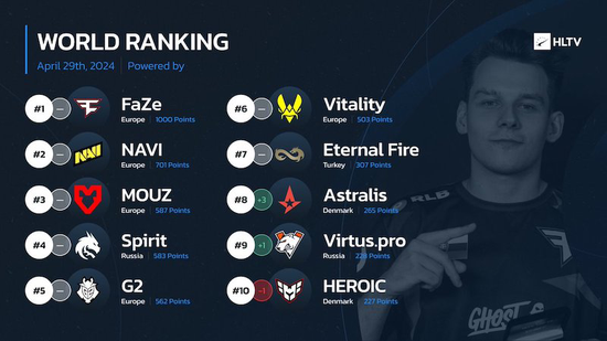 1-10名中Astralis和Virtus.pro两支队伍排名上升,A队从11名来到8名 ,突入Top10榜单当中。不过前七名没有任何变化,FaZe依旧是稳居第一宝座。