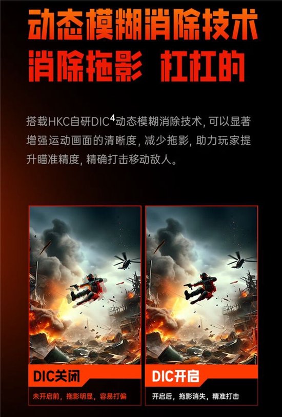 值得一提的是,HKC猎鹰二代G24H2/G27H2均搭载了HKC自研的DIC(Dynamic Image Clarity Technology)黑科技,当开启DIC模式时,显示器可通过插入黑帧的方式消除运动模糊和拖影问题。这一技术极大地提升了显示器的响应速度,有效减少了画面延迟。这或许也是印证了之前官方预热海报所说的FPS电竞显示器除了高刷之外还需重视的东西:消除模糊、减少拖影,致力为玩家打造更畅快的游戏体验。