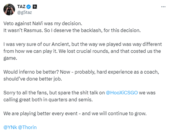 然而,尽管取得了这样不可否认的好成绩,HooXi仍然被许多人指责为战队失利的根本原因,而他们的教练Wiktor Wojtas | TaZ随后出面为他辩解(半决赛G2不敌Natus Vincere后)。