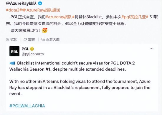 由于东南亚战队都没有签证,所以将由中国战队AR替补Blacklist参赛。