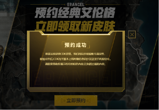 第三部,当预约成功后,会提醒“预约成功”的界面,说明您已成功,等待核实结束后就会获得经典艾伦格的新皮肤游戏CDK奖励。