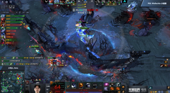 38分钟Aurora开雾死亡冲锋,在夜魇前哨抓到末日,但是输出根本不够击杀末日,XG队员全球流瞬间赶到战场,Aurora正面团战完全溃败,最终被团灭以后Aurora只能敲出GG。