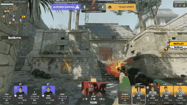 来到上半场,donk单人突破三杀配合队友突破包点拿下手枪局,来到长枪局,还是donk完美的个人能力发挥,在占领包点后利用掩体来回腾挪,不停peek,拿下三杀帮助队伍拿下残局,将比分带至4-0。马上又是一波单人4杀,再次拉开分数。此后,终于在r3salt的包点发挥下,CT顶住进攻,帮助队伍拿下第1分。但马上chopper关键的残局1发带走对手拿下1v1,帮助队伍稳住军心,将比分拉开,此后,进攻方连续通过中路的进攻打开防守缺口,终于在上半场最后,KENSI单人三杀帮助队伍顶住了进攻,拿下最后一分,在上半场进攻方以10-2领先结束。